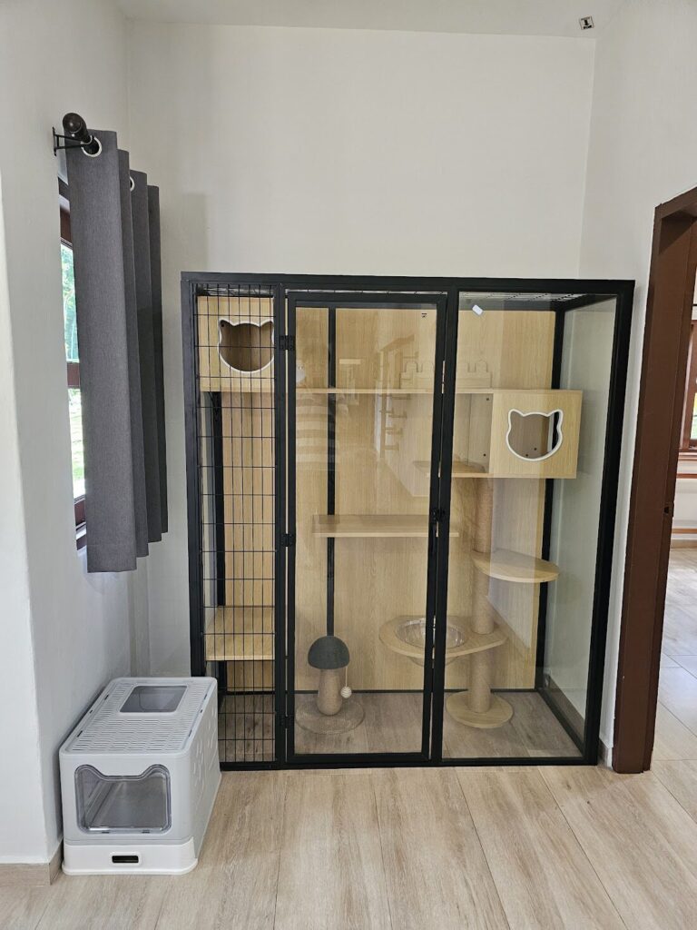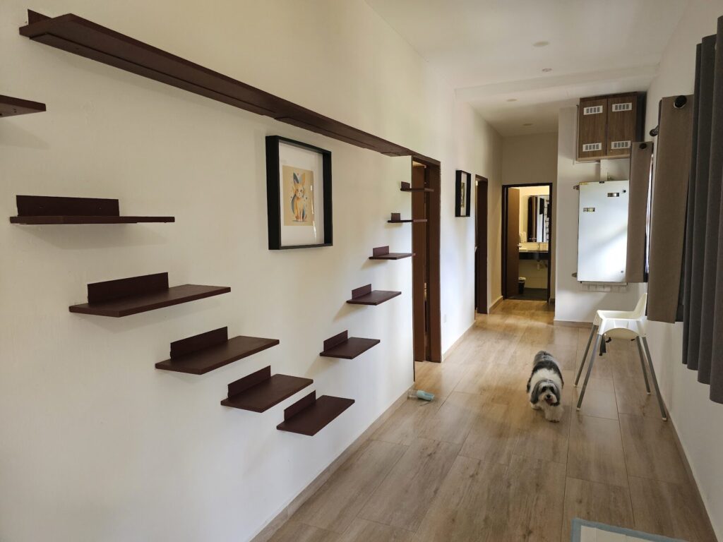 The first thing that stands out is the sheer size. It’s set up like a proper bungalow stay rather than a compact chalet—four bedrooms, a large living area, a big kitchen, and multiple toilets, which makes it genuinely workable for a larger family or a group gathering. What’s especially interesting (and something you don’t see often in local stays) is how deliberately the interior considers cats: there’s a dedicated “multi-storey” living/climbing space and a specially designed obstacle-style climbing feature in the living room, so kitties can perch, explore, and keep themselves entertained without you improvising with luggage and chairs.