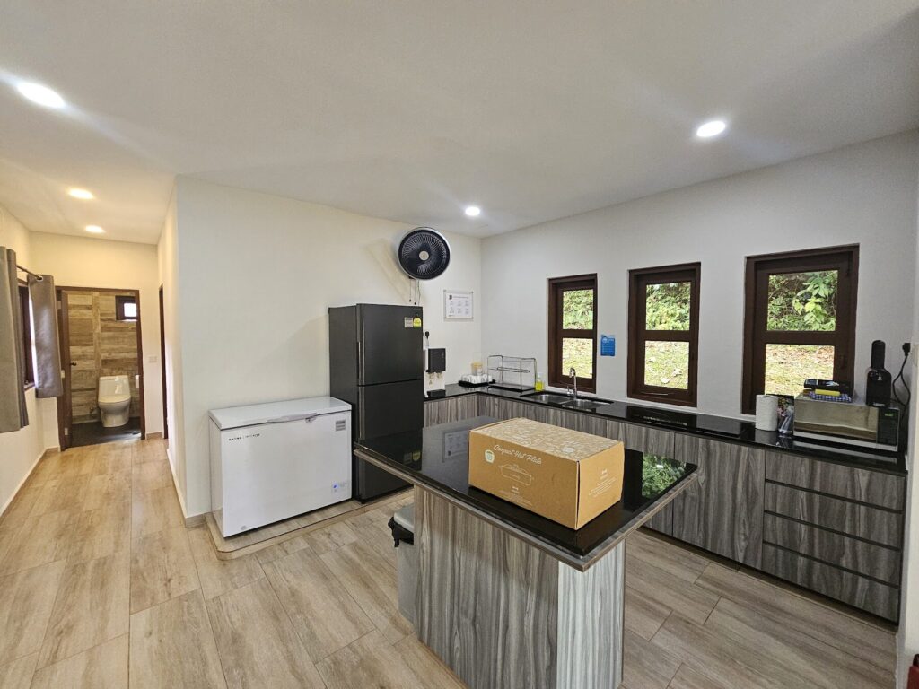 Food-and-drink wise, this is much more of a “self-cater and be comfortable” setup than a resort with on-site dining. The bungalow’s kitchen is a major plus: it’s spacious and comes equipped with essentials like plates, cups, a rice cooker and microwave (and other gears), which makes it easy to do family meals, hot drinks, and family-style cooking without feeling like you’re camping. There’s also a spacious sheltered outdoor BBQ area, so if you bring your own ingredients and supplies, it’s well suited to grilling and eating outdoors while still having cover.