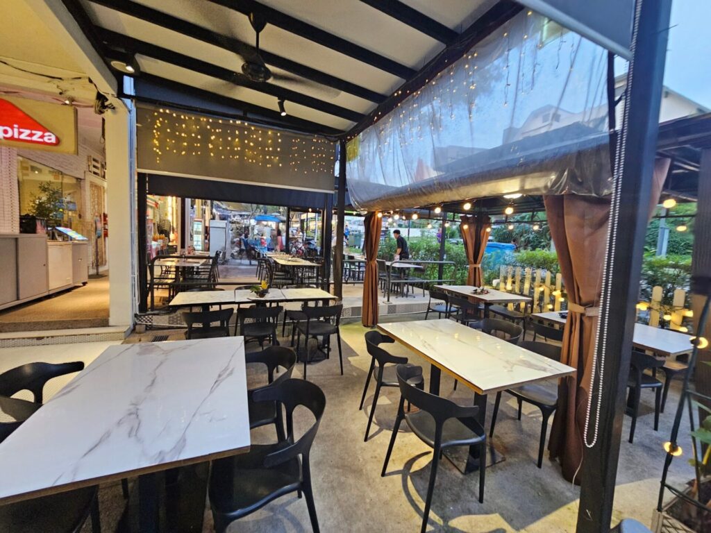The outdoor seating area adds to the charm with its spacious layout, making it a perfect setting for dining with pets. While it could benefit from additional fans for daytime cooling, the breeze during the evening is usually enough to keep things comfortable.