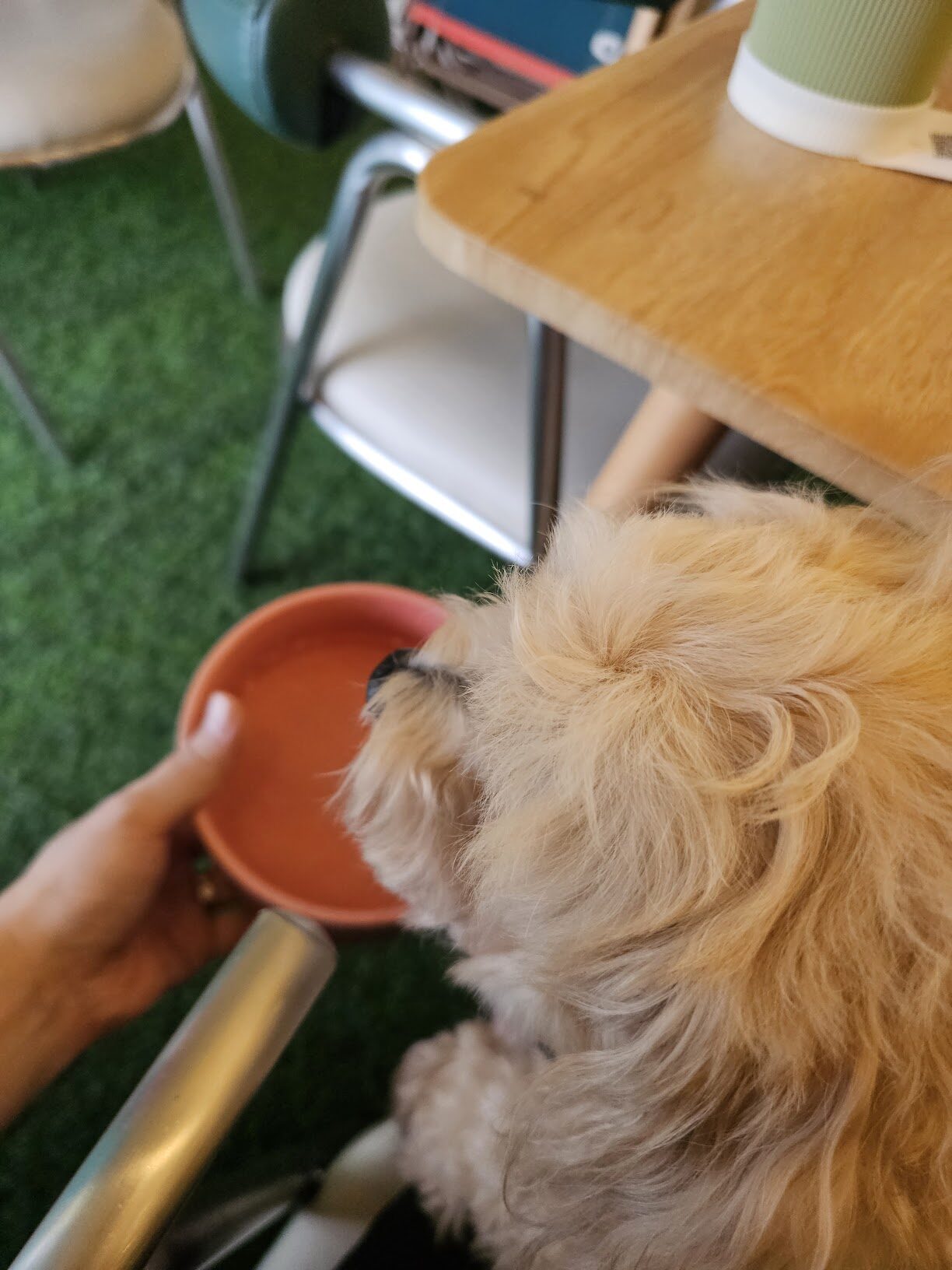 To: YOU Cafe is a very charming gem nestled in the city, designed with pet lovers in mind. The atmosphere is cosy and thoughtfully laid out, and it’s easy to feel at home the moment you step in. One of the most delightful aspects of this cafe is its semi-indoor outdoor seating area — a beautifully designed space with lots of natural light, ample ventilation thanks to a large ceiling fan, and incredibly comfortable seating. The minimalistic aesthetic is very lovely and elevated by little thoughtful touches like the adorable doggie mirror that adds a fun, interactive element for our furry companions.